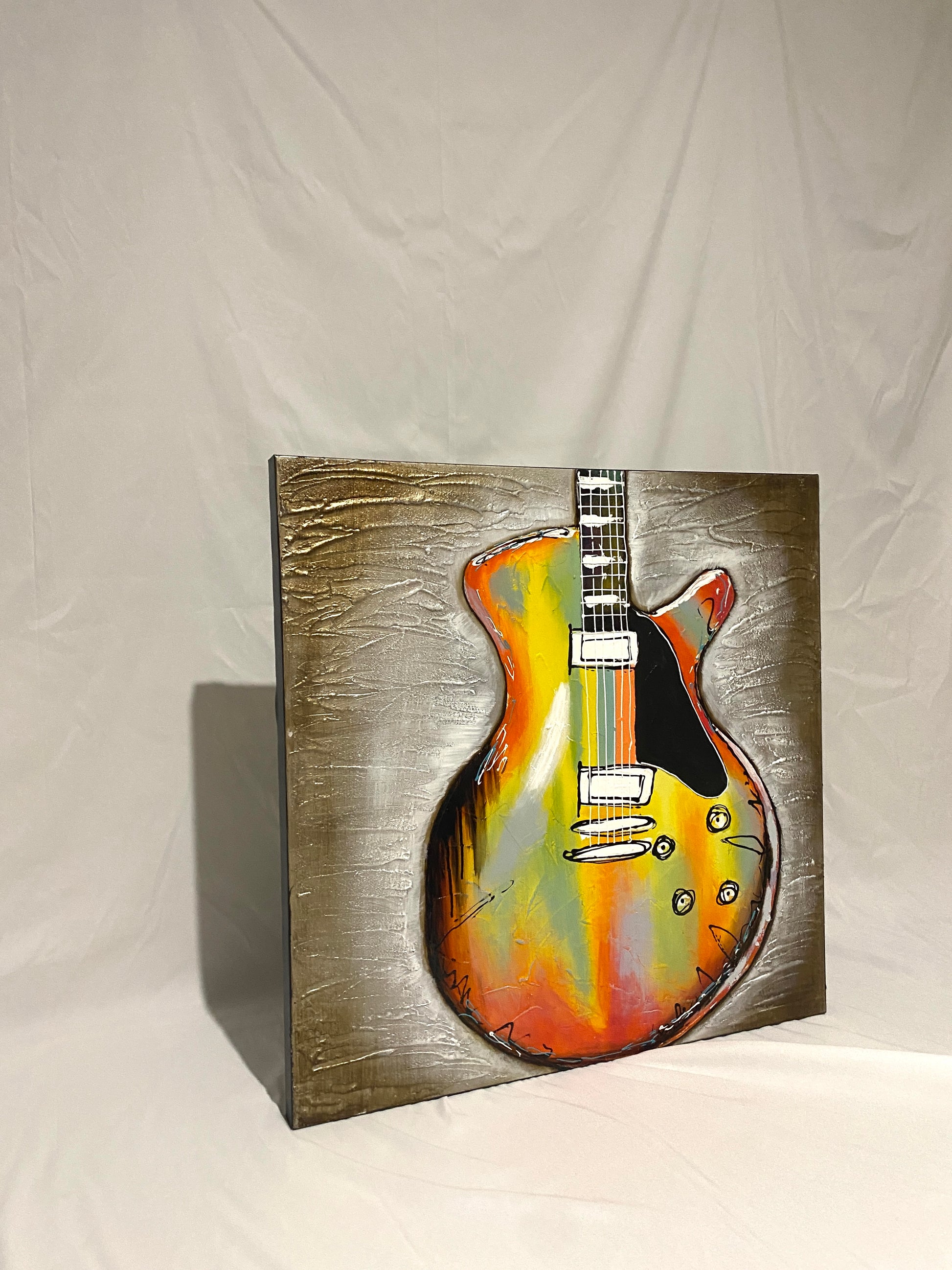 The textured look and dynamic composition make it an eye-catching addition to studios, lounges, living rooms, or entertainment spaces.