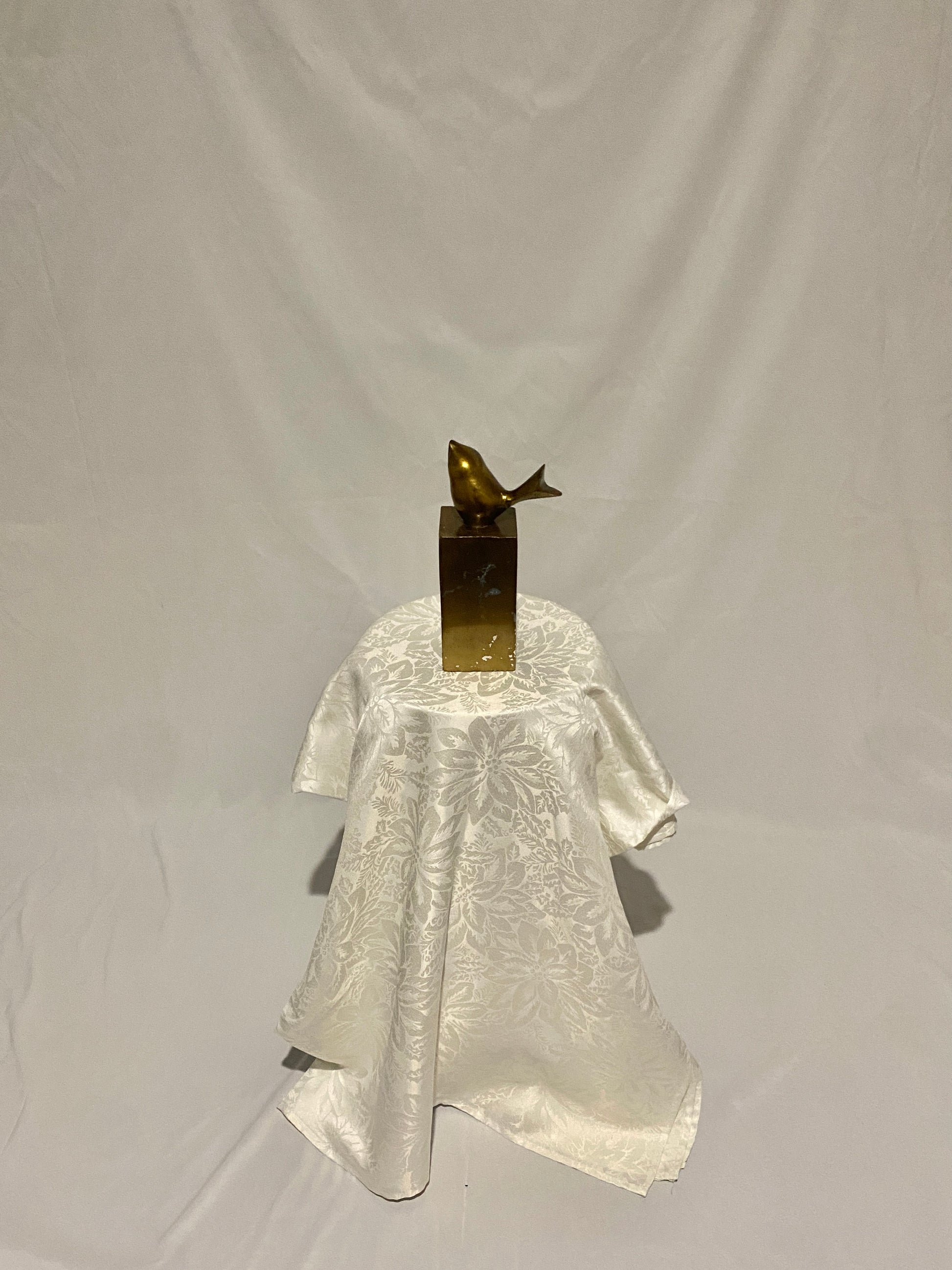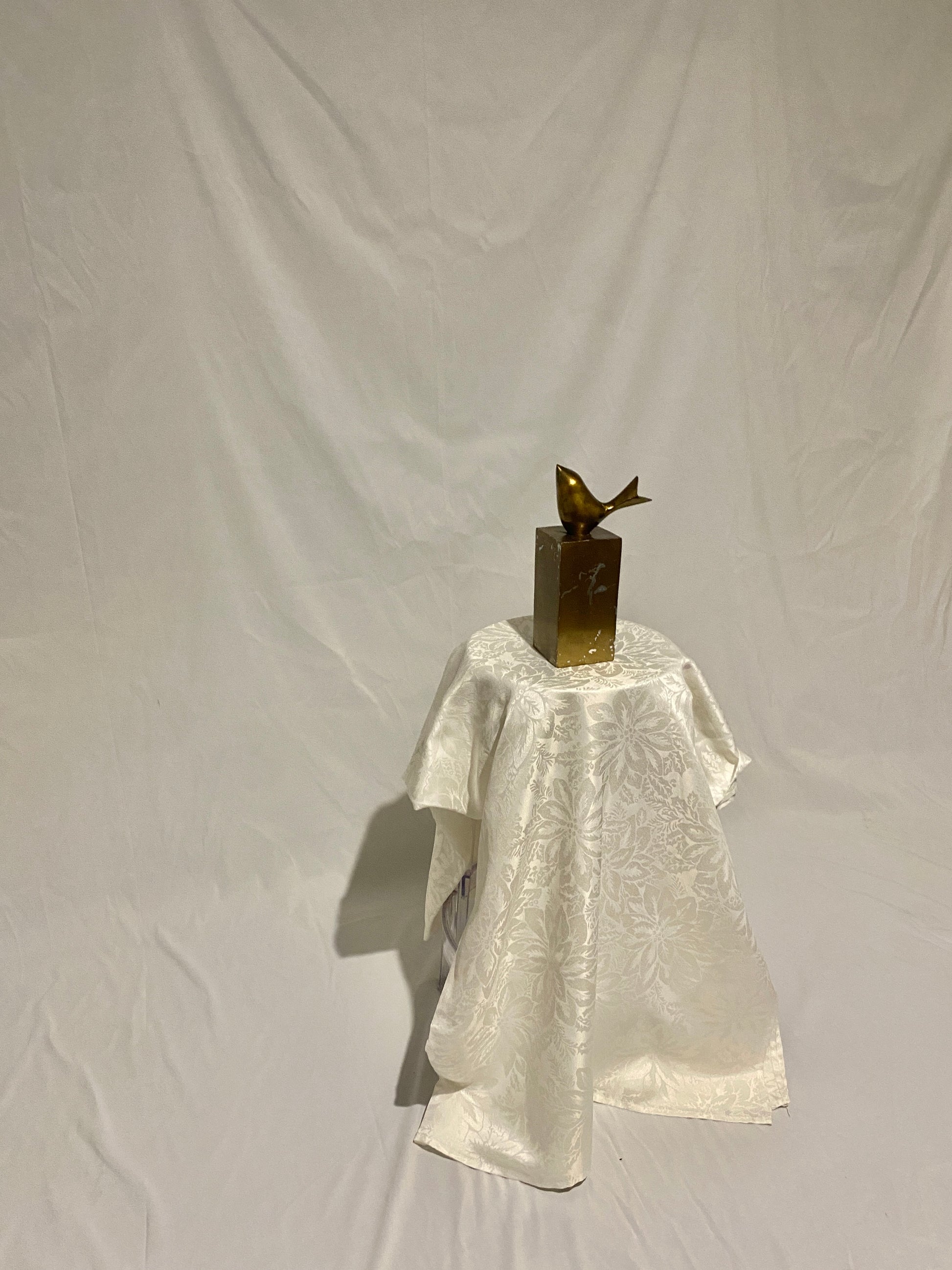 This minimalist sculpture features a stylized golden bird perched atop a solid rectangular base, merging elegance with simplicity.