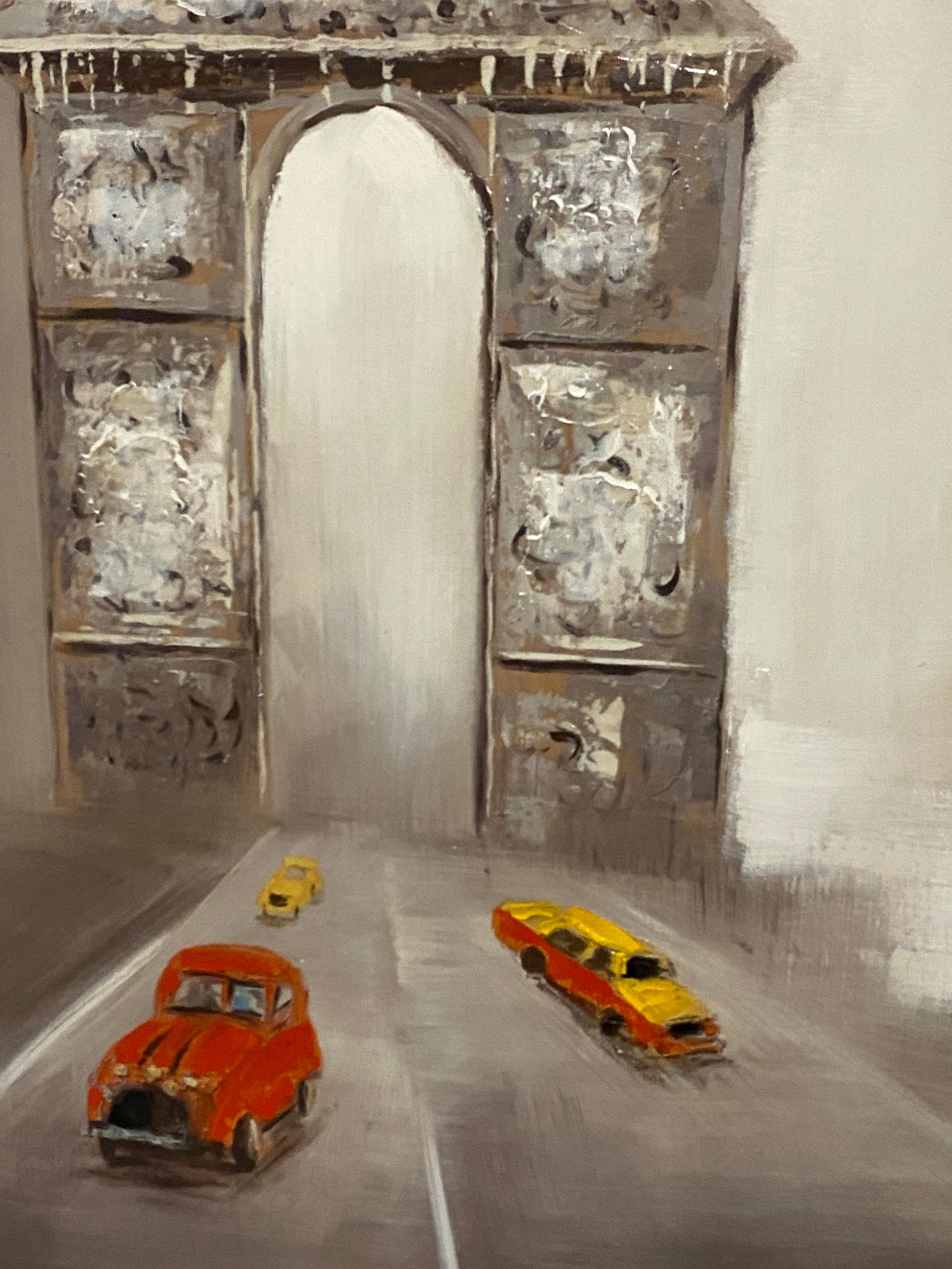 A woman in a vivid red dress walking through misty streets as vintage cars pass under the grand Arc de Triomphe — a timeless dance between solitude and motion.